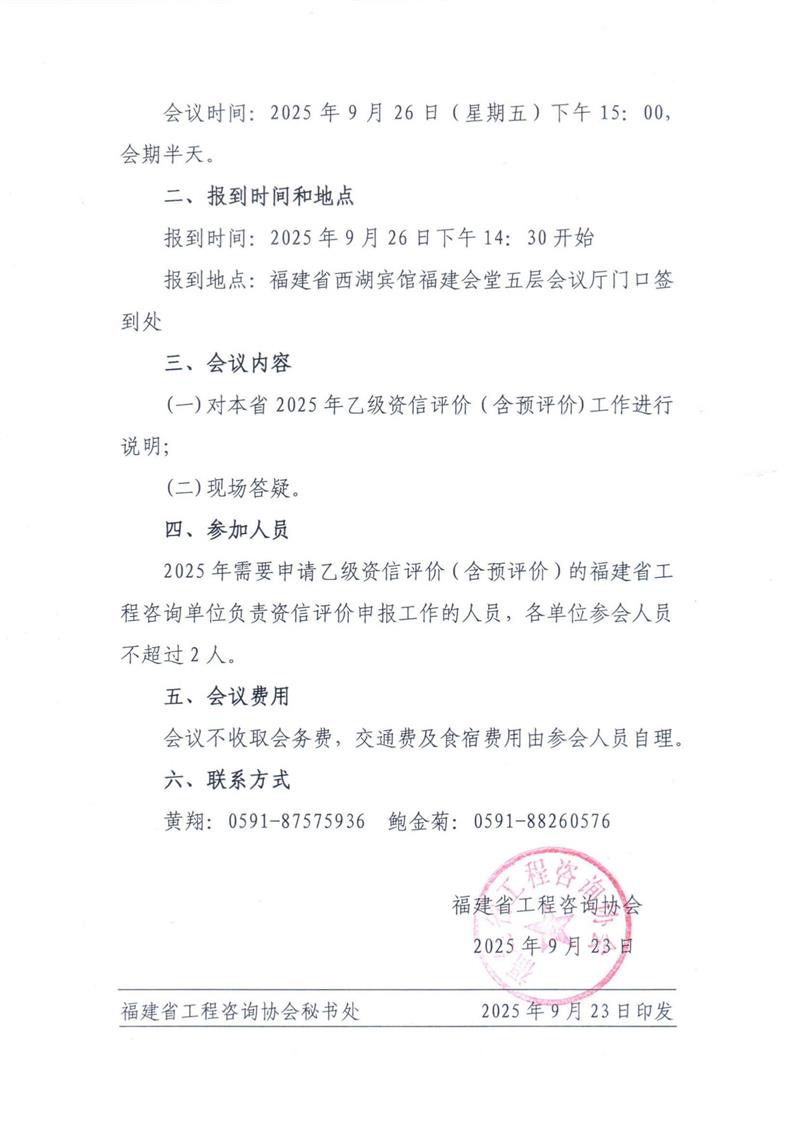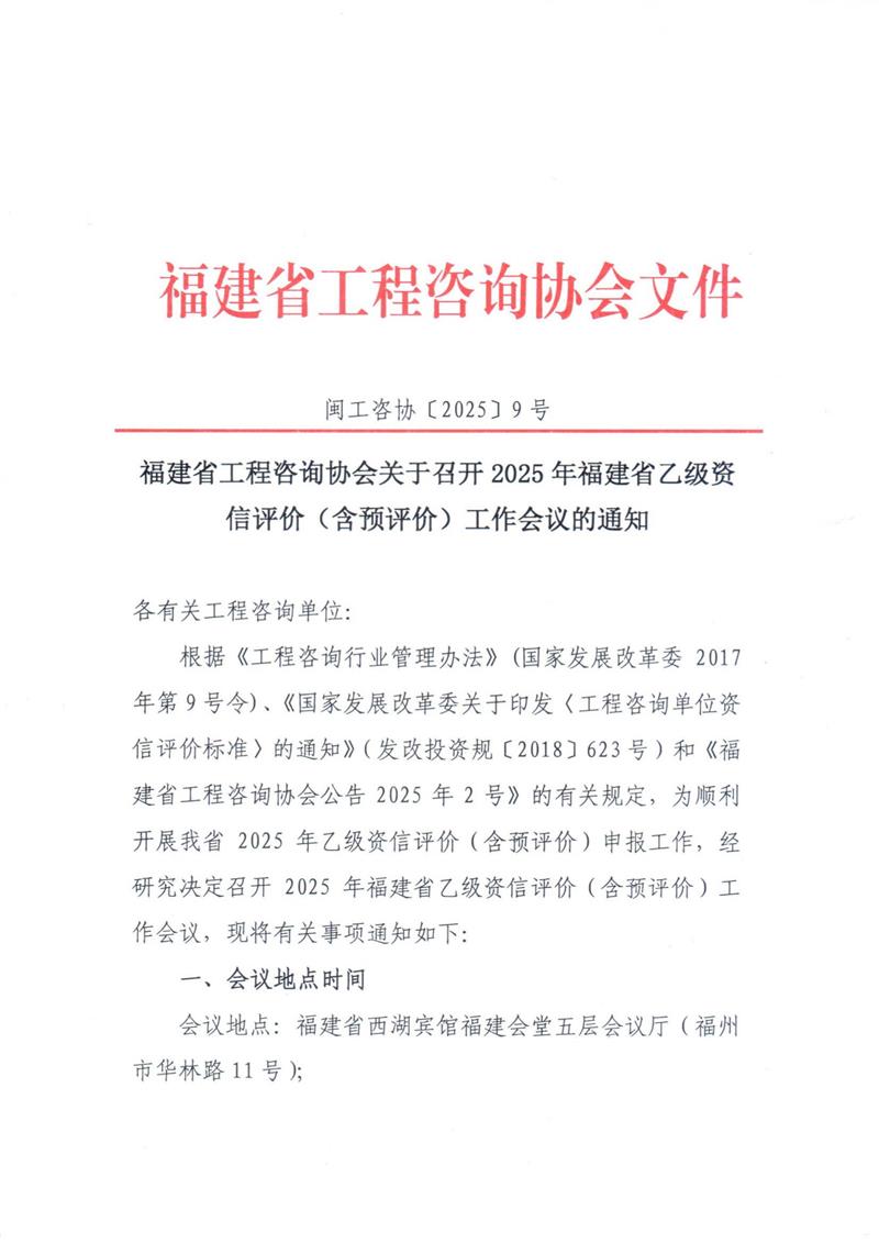 福建省工程咨询协会关于召开2025年福建省乙级资信评价(含预评价)工作会议的通知