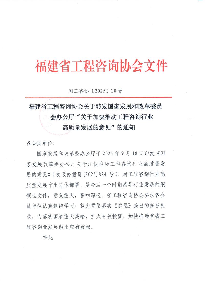 福建省工程咨询协会关于转发国家发展和改革委员会办公厅“关于加快推动工程咨询行业 高质量发展的意见”的通知