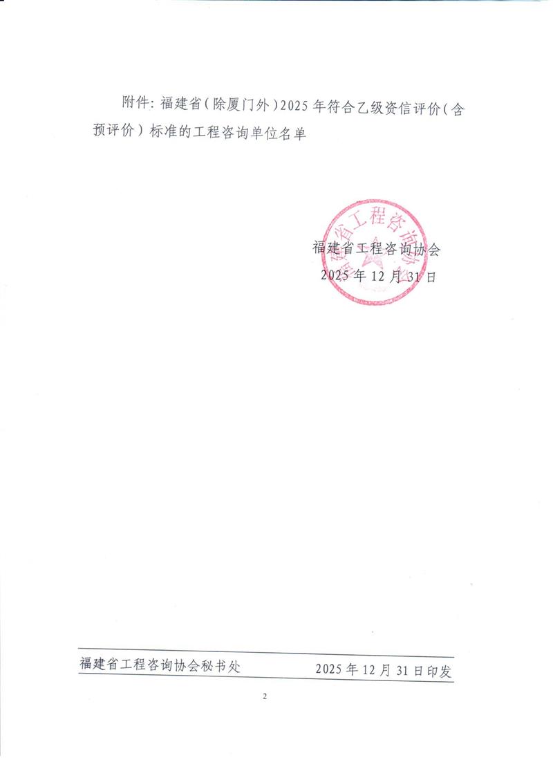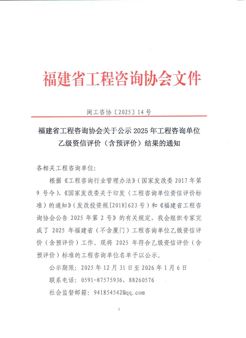福建省工程咨询协会关于公示2025年工程咨询单位乙级资信评价(含预评价)结果的通知